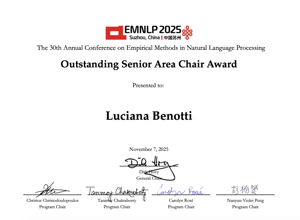 In addition, on this occasion, Luciana Benotti received the Outstanding Senior Area Chair Award, granted by the ACL during the conference, in recognition of her outstanding work evaluating scientific papers for #EMNLP 2025 within the Human-Centered NLP area.