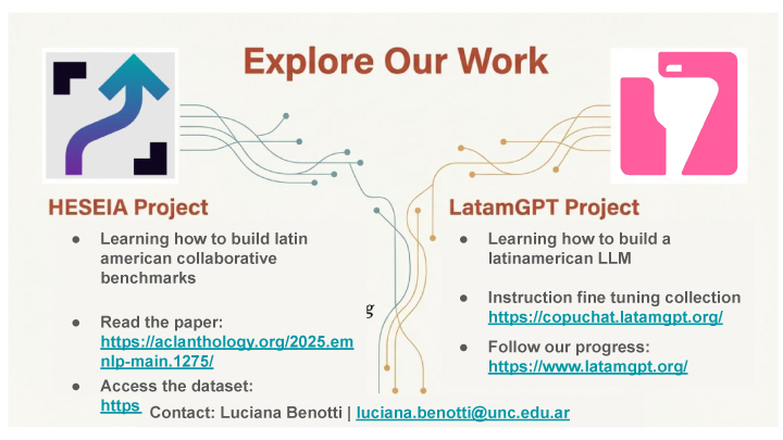 In her presentation, Luciana discussed our work on HESEIA, our project for assessing bias in language models, and and talked about  Latam-GPT, a collaborative Latin American initiative to develop LLMs from local perspectives—promoting linguistic and cultural diversity, strengthening regional technical capacity, and advancing technological sovereignty.